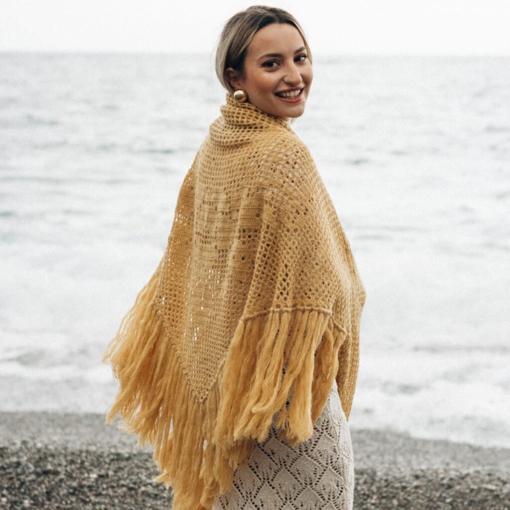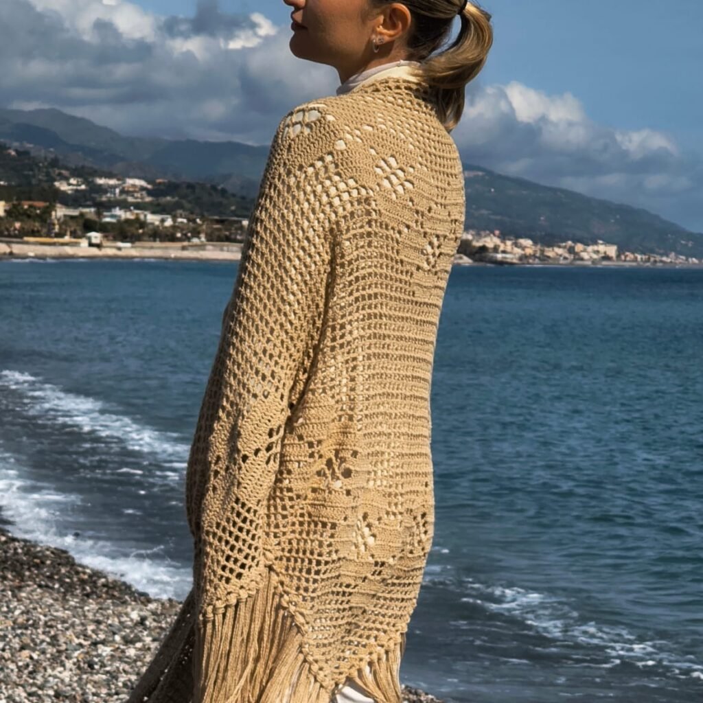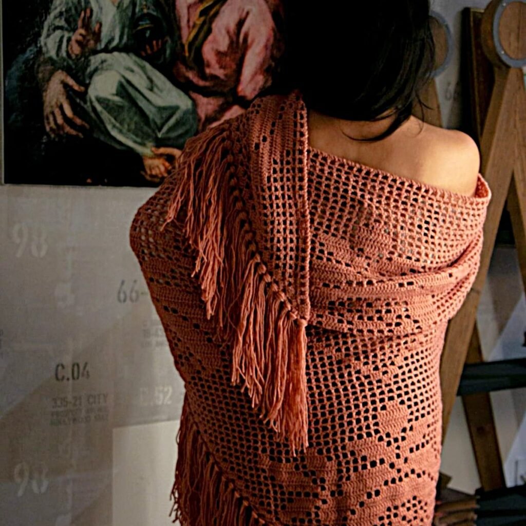 Scialle in cotone color cioccolato con frange e bordo in cotone nocciola